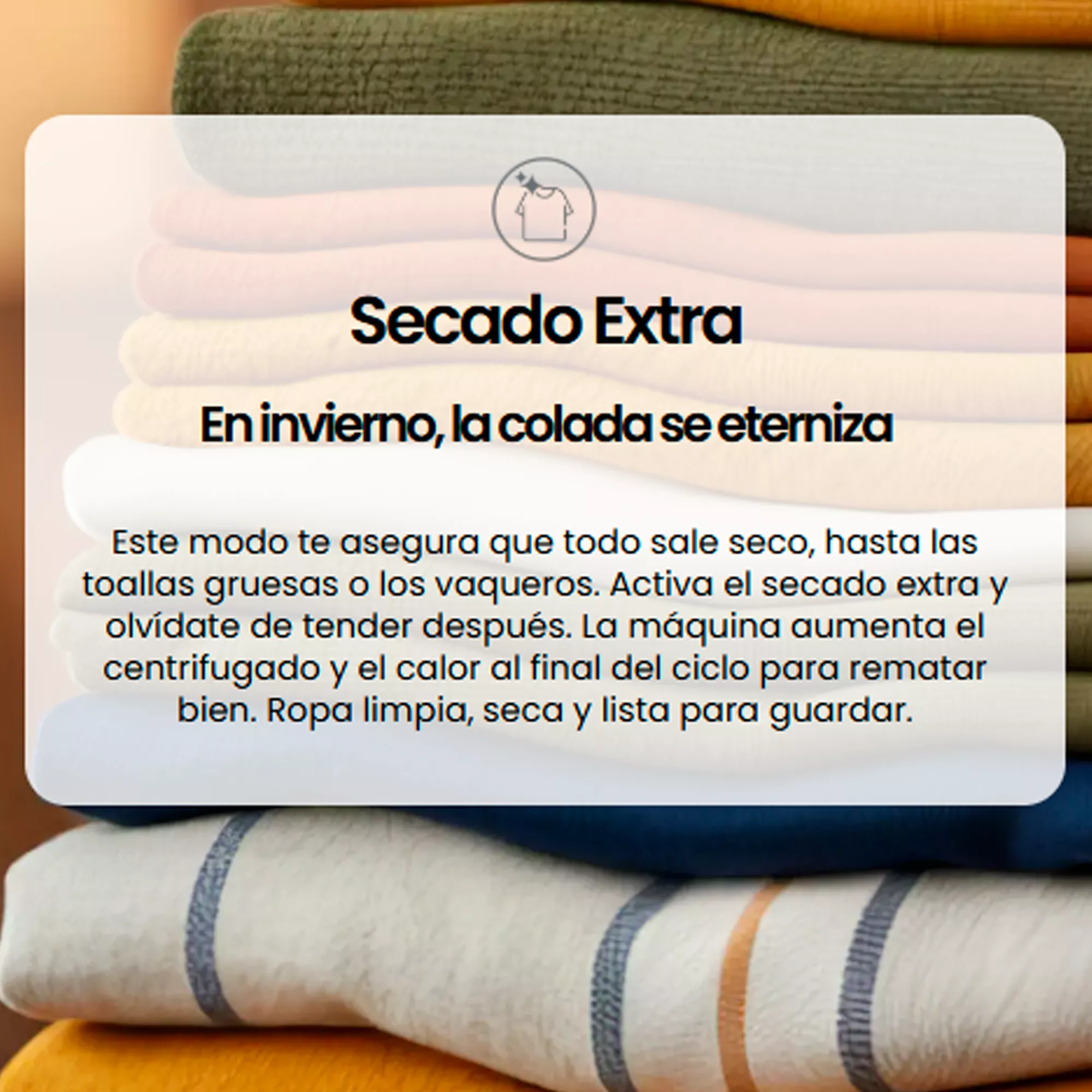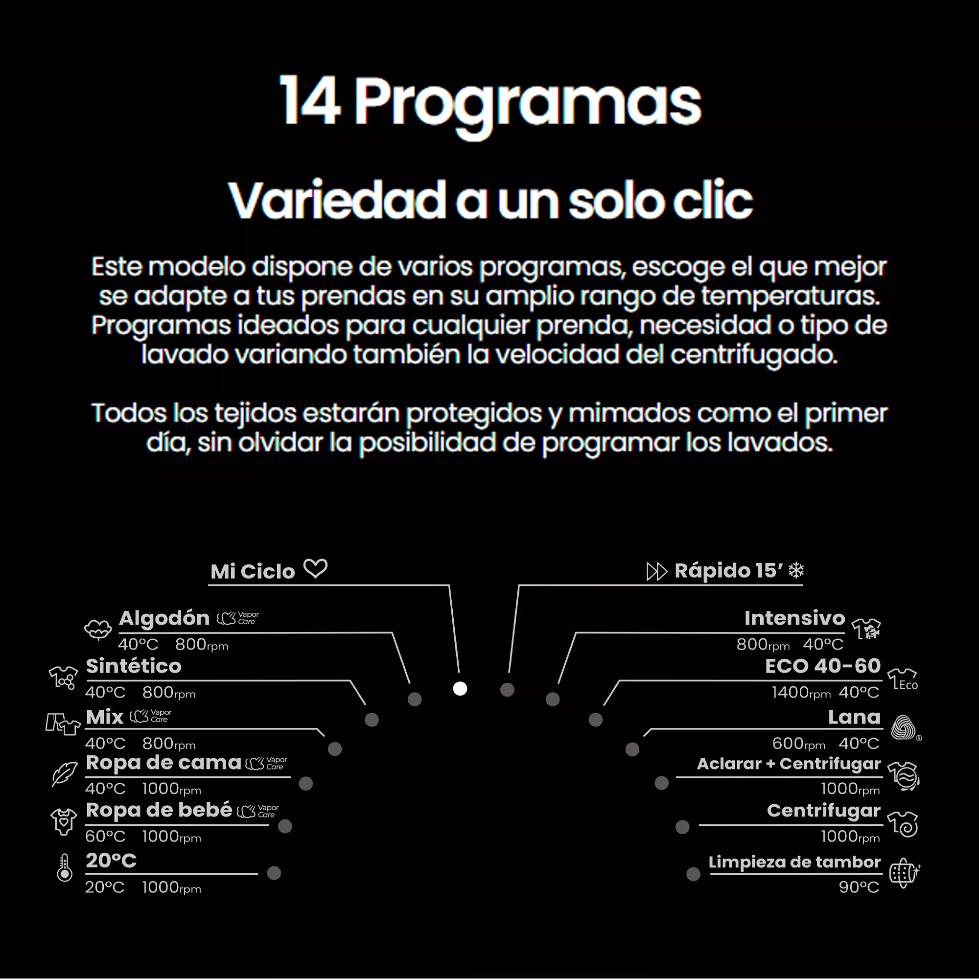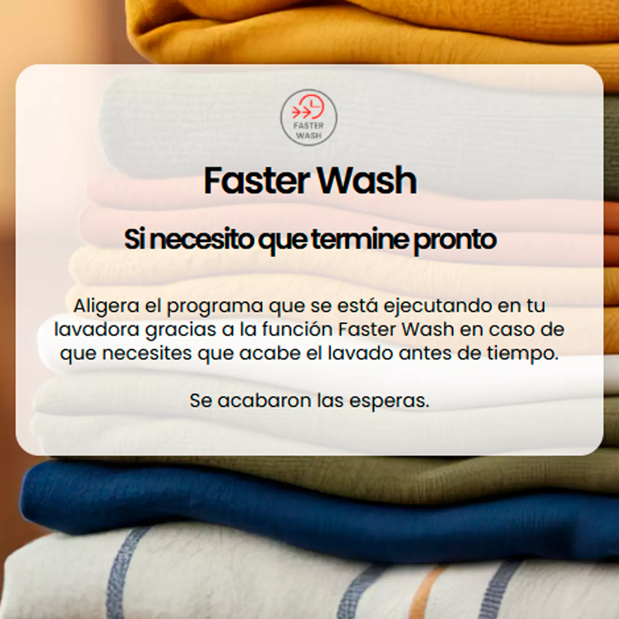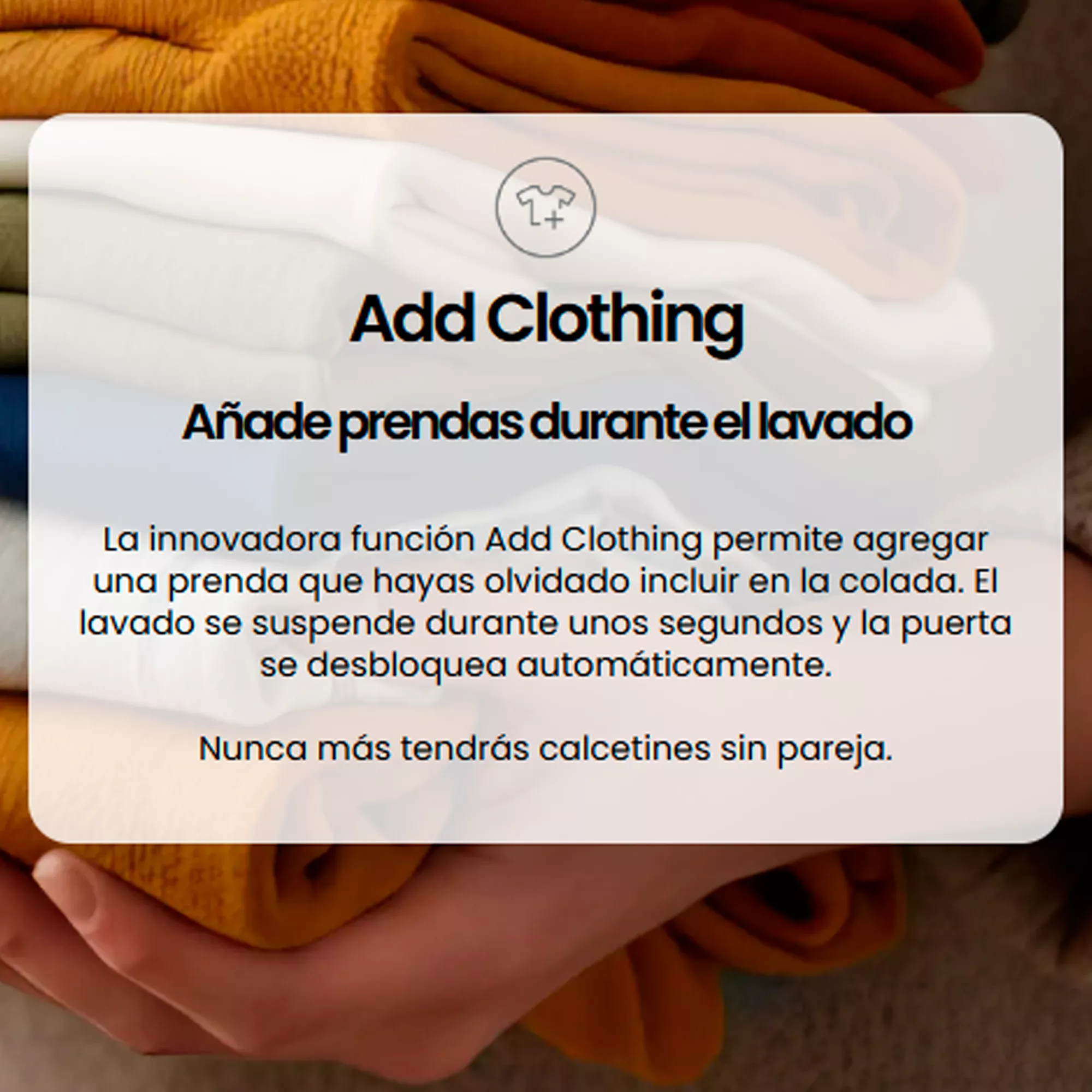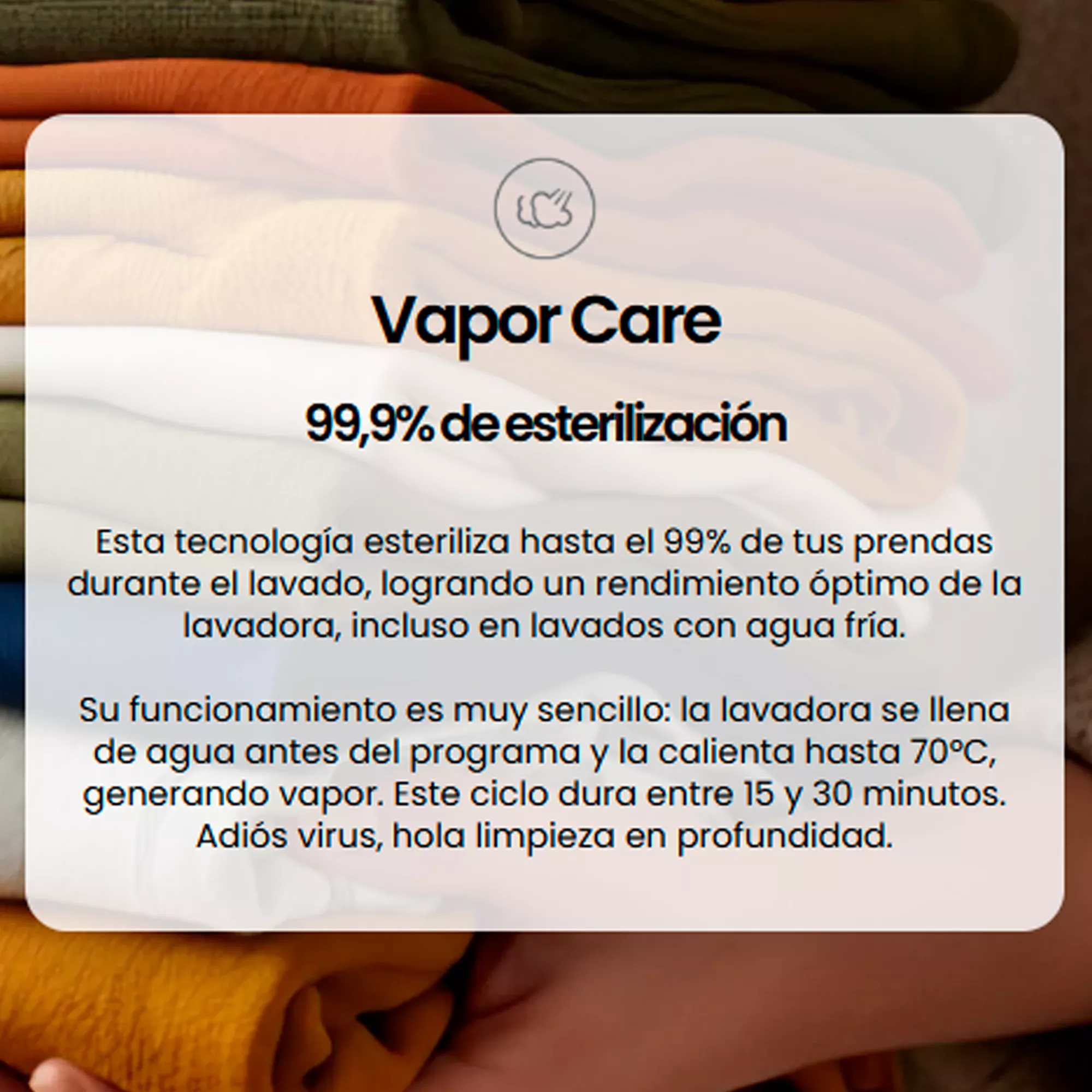 Otras características:Función especiales: – Mi ciclo – Faster wash – VAPOR CARE: Esteriliza y desodoriza tu ropa – ADD CLOTHING Función Lavado en frío Función Secado extra Función bloqueo de seguridad