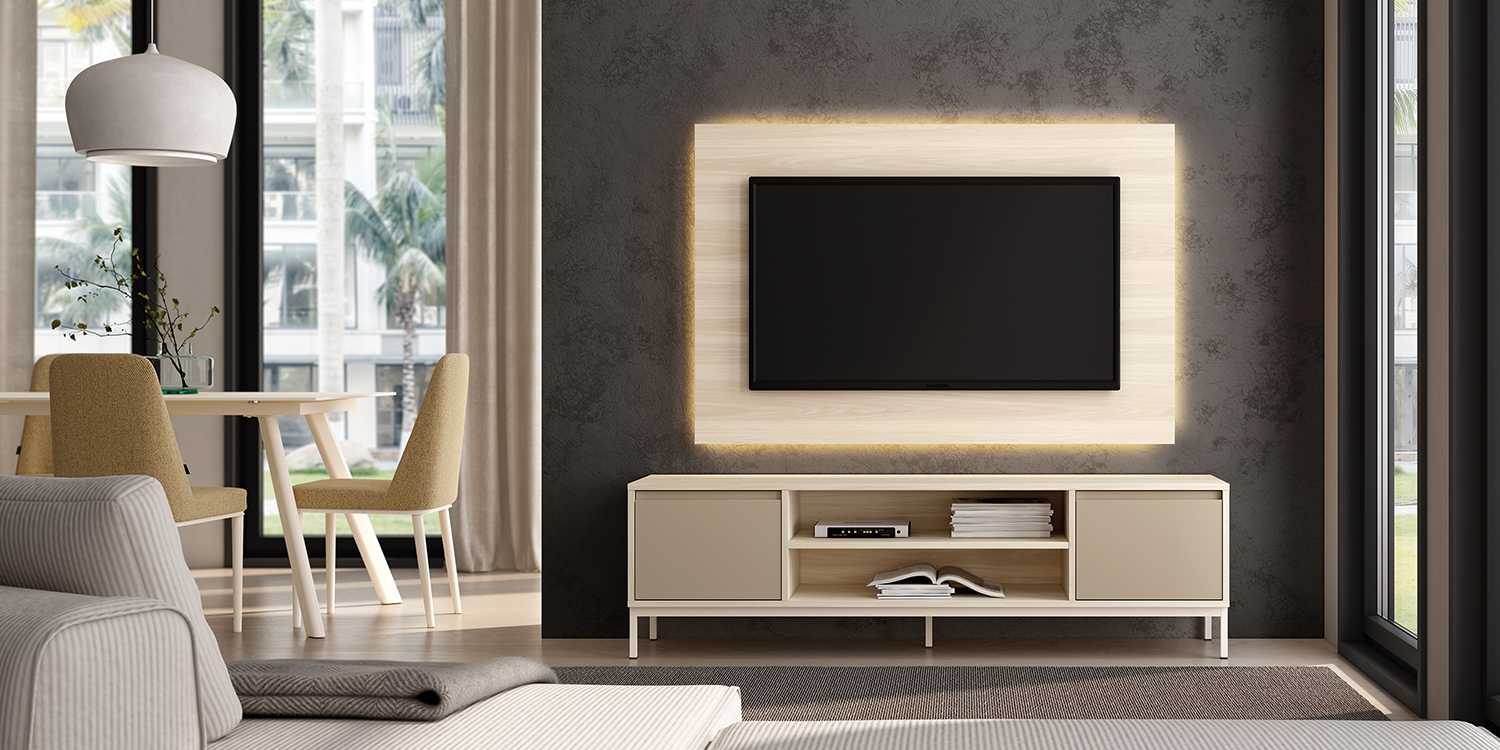 El conjunto incluye un panel TV integrado de gran formato que protege la pared y aporta uniformidad visual, creando un ambiente limpio y sofisticado.