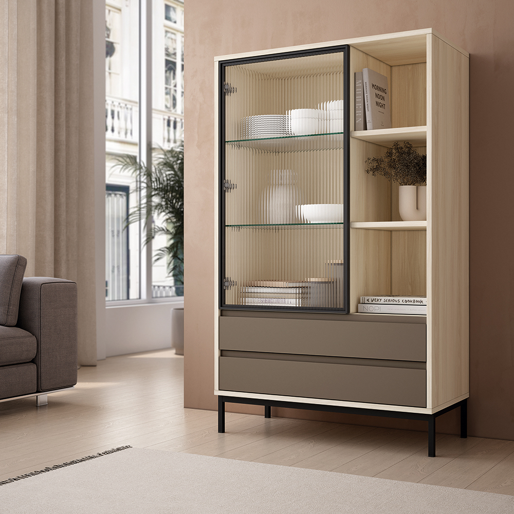 Este módulo incluye una puerta abatible con cristal, ideal para mostrar vajilla, decoración o libros, junto con 2 cajones inferiores que ofrecen almacenamiento práctico y discreto. Además, cuenta con 3 huecos abiertos perfectos para tener a mano tus objetos más utilizados.