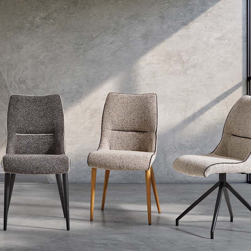 Silla con tela modelo Milán en diferentes colores y con tratamiento waterproof de fácil limpieza. Patas metálicas en diferentes acabados y estructura de gran resistencia.