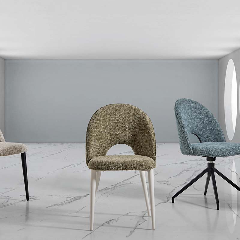 Silla con tela modelo Milán en diferentes colores y con tratamiento waterproof de fácil limpieza. Patas metálicas en diferentes acabados y estructura de gran resistencia.