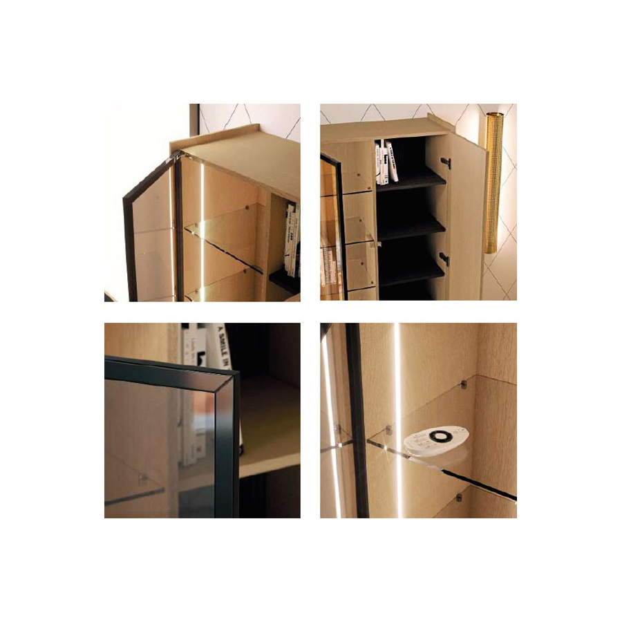 En su interior, incorpora 10 estantes que ofrecen una gran capacidad de almacenamiento y organización. Además, incluye iluminación LED integrada en el lateral izquierdo, ideal para destacar los objetos exhibidos y crear una atmósfera cálida.